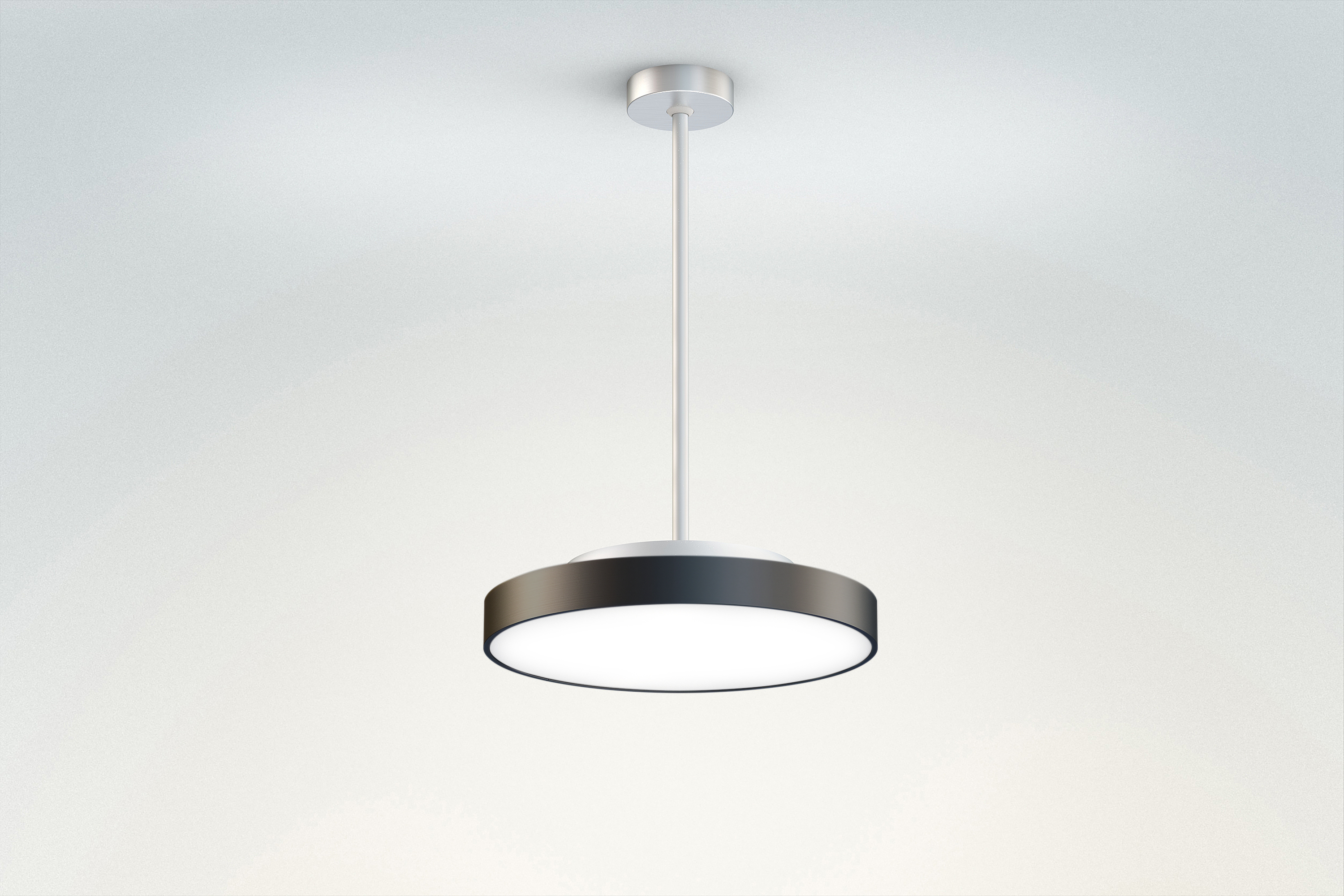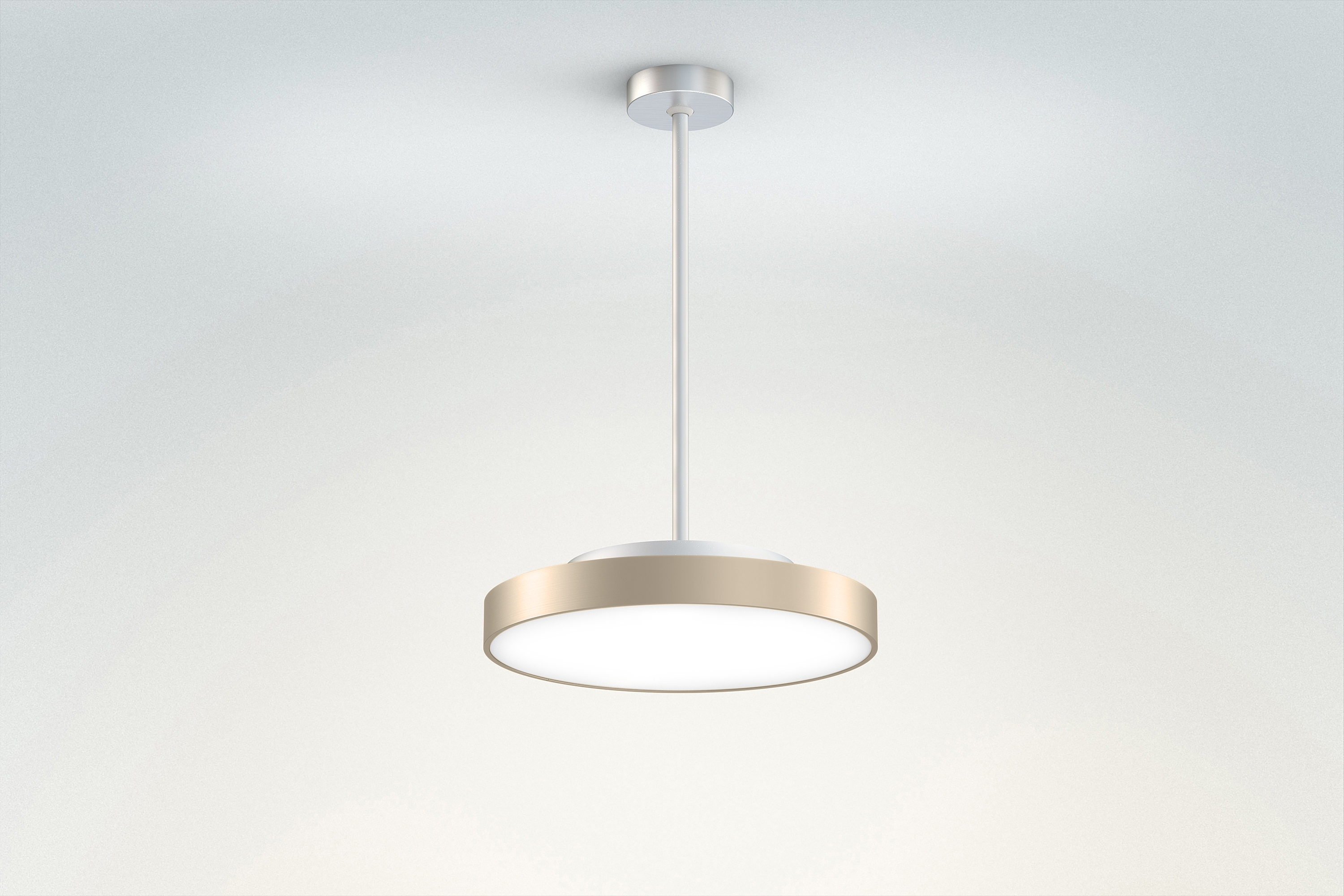Rückbau, Ring, Pendelrohr und Rosette in Aluminium gedrückt und farblos eloxiert (auch RAL oder NCS möglich), Abdeckung unten Acrylglas satiniert oder prismatisch